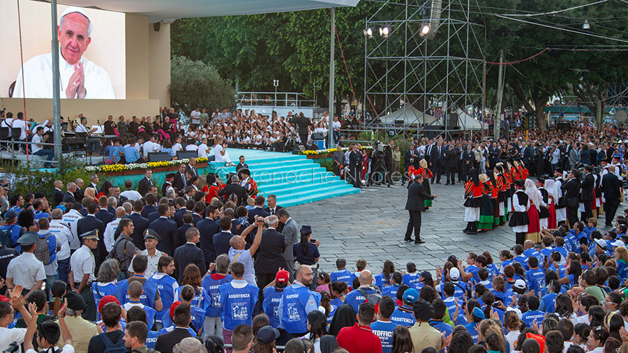 Dopo l’incontro con i lavoratori, nel Largo Carlo Felice, e la santa Messa celebrata nel sagrato della Basilica di Bonaria, nel pomeriggio Papa Bergoglio incontrò i giovani in via Roma, accolto da una folla immensa, dalle note intonate dal Tenore Murales di Orgosolo e dal ballo del Gruppo Folk orgolese i quali, con la loro partecipazione all’evento portarono un tocco di autentica tradizione sarda e emozionarono non poco il Pontefice.