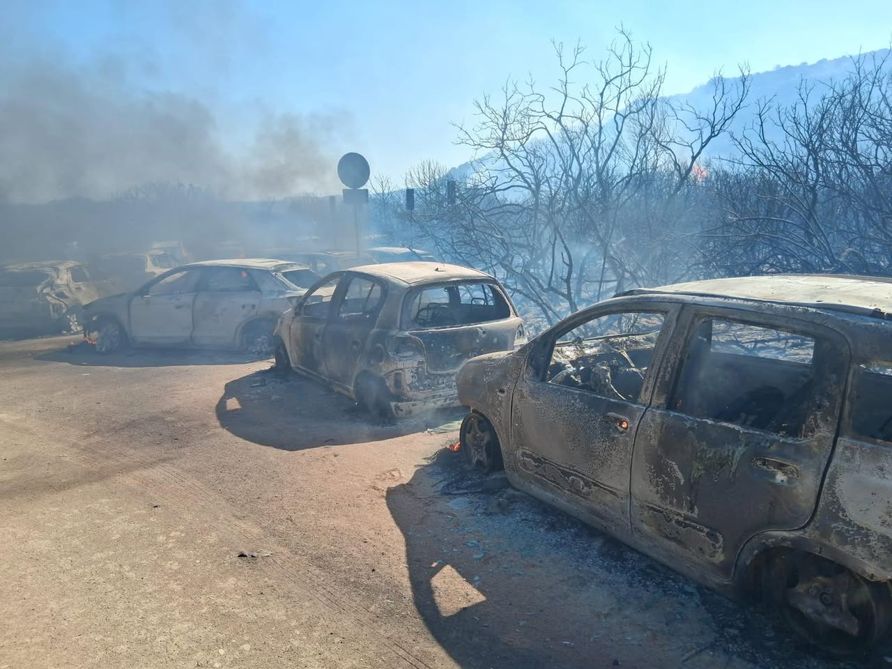 Il rogo, alimentato da un forte vento di maestrale, si è propagato rapidamente dalla vegetazione a ridosso della spiaggia, creando un vero e proprio “muro di fumo” alto diversi metri che ha intrappolato i bagnanti. Le fiamme, altissime, hanno raggiunto il parcheggio, divorando diverse auto e rendendo impossibile la via di fuga via terra per molti. La scena è stata di totale caos: mentre alcuni tentavano disperatamente di raggiungere i propri veicoli, molti hanno preferito rimanere vicino all’acqua, l’unico rifugio dal calore e dal fumo.