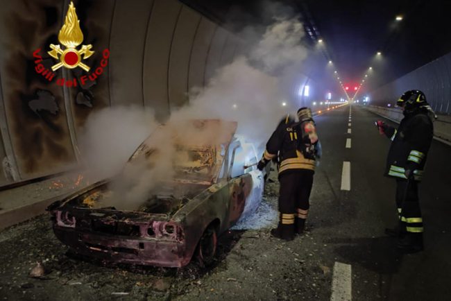 Le fiamme hanno avvolto una Opel Kadett mentre percorreva il tunnel, sprigionando una densa coltre di fumo che ha reso immediatamente critica la visibilità e la sicurezza nell’area.