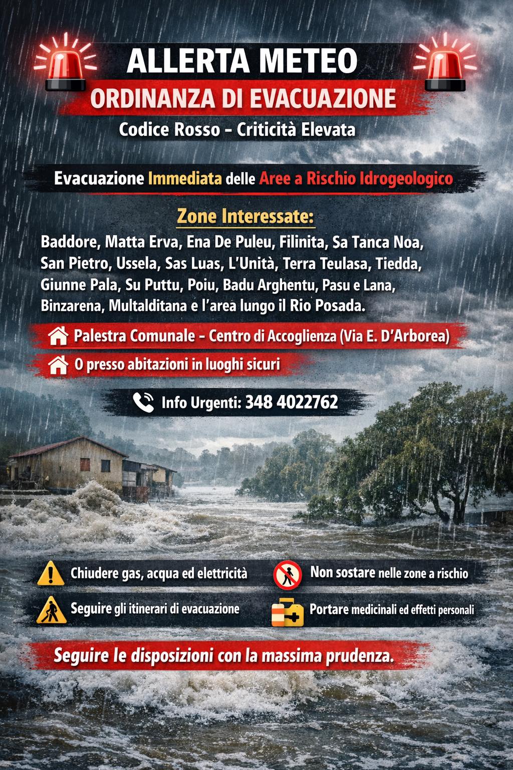 L’EVACUAZIONE – L’avviso dell’amministrazione comunale di Torpè riguarda numerose località del territorio, tra cui: Baddore, Matta Erva, Ena De Puleu, Filinita e Sa Tanca Noa; San Pietro, Ussela, Sas Luas, L’Unità e Terra Teulasa. Tiedda, Giunne Pala, Su Puttu, Poiu e Badu Arghentu. Pasu e Lana, Binzarena, Multalditana e l’intera fascia lungo il rio Posada.